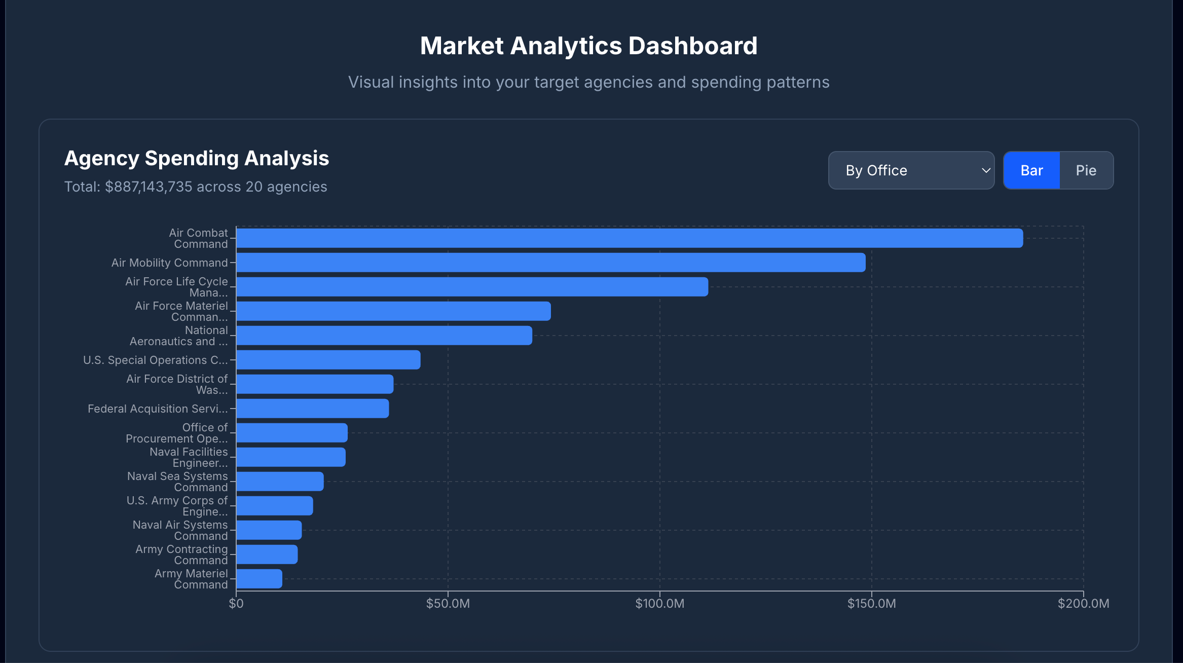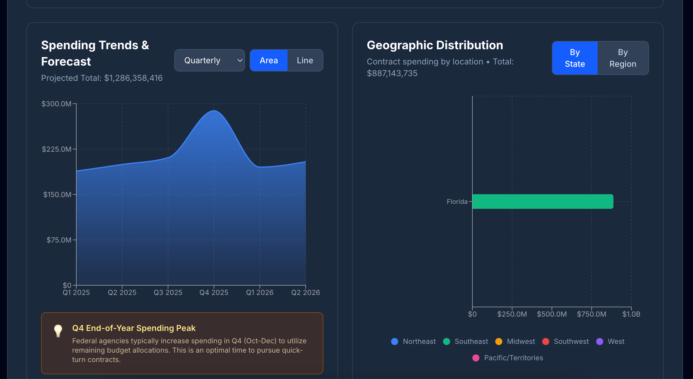 As an 8(a) company, the Market Analytics dashboard showing agency spending by quarter was eye-opening. We now know exactly when to time our outreach for Q4 spending pushes.
